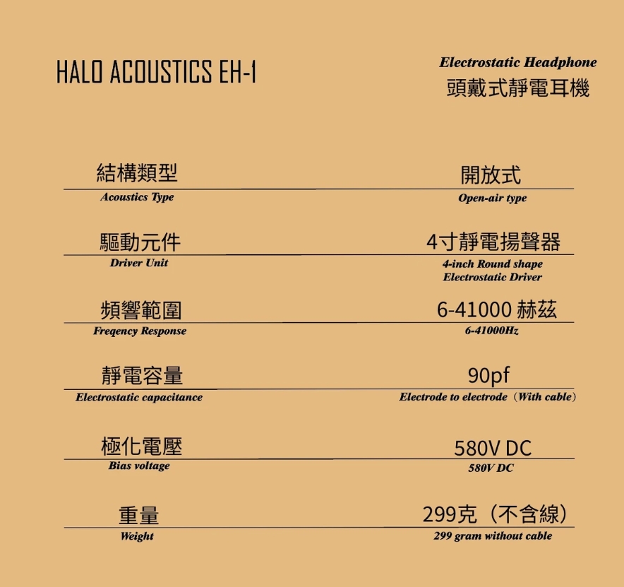 核心技術架構採用4吋圓形靜電驅動單元,透過高精度極板加工與均勻振膜張力控制,使整體振動行為更穩定。V4版本導入LiDAR測繪技術,提升極板平整度與一致性,並優化內外聲學結構配置。耳機部分採開放式設計,搭配重新設計的耳罩與頭梁系統,進一步改善聲音傳導與佩戴穩定性。EHA-1 V4耳機擴大機則提供580V偏壓與穩定驅動能力,確保靜電單元完整發揮性能。