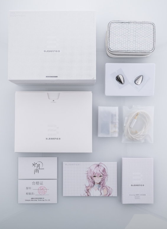 Blessing 3 延續了前作依靠 3D 打印實現的物理分頻框架,同時創新地開發了新的水平對置雙動圈低音單元模組,帶來比前作更高的動態範圍和更低的大動態非線性失真。在前作的基礎上進一步優化的中高音單元混合式分頻,在保障一如既往的超高音細節的基礎上,優化了中高音的街接和平滑度,結合全新的低音模組,帶來更加澎洴、飽滿、自然的音質。