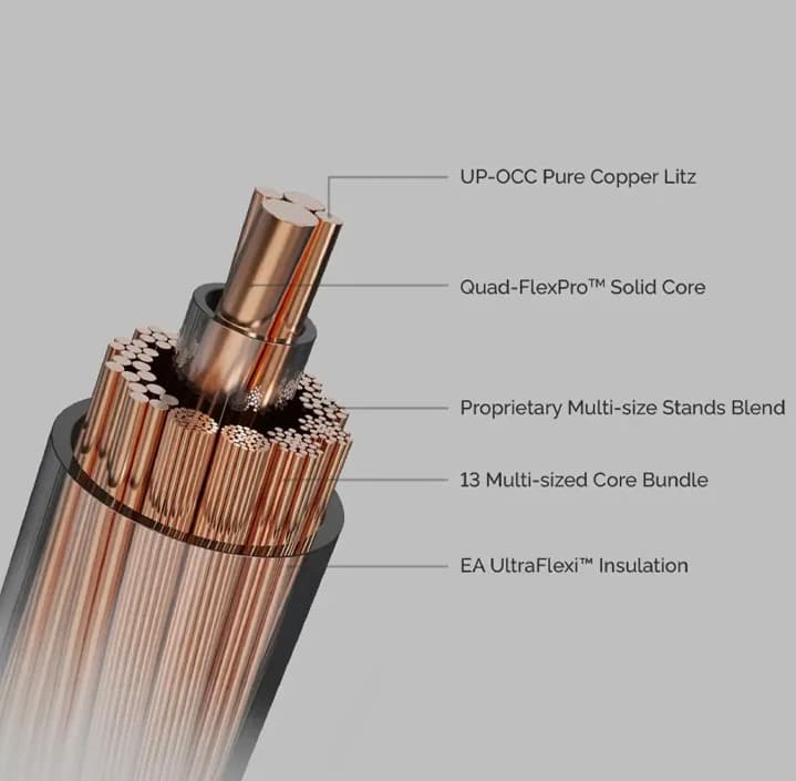 第三代實心核心系統 Quad-FlexPro™ Solid Core System,由 2024 年的 Trio-Flex™ 架構演變而來。中央導體現在由四個獨立校準的實心導體組成,每個核心都為其頻率角色進行了精確調整。
