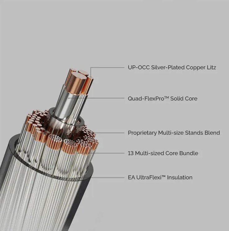 線材同樣採用了 Quad-FlexPro™ Solid Core System 技術,旨在最大化鍍銀銅材質的優勢:粗芯提供穩固的電流基礎以避免聲音過於輕薄,中等芯保持中性的音色,而兩條細芯則被推向極限,以實現閃電般的速度與水晶般剔透的細節分析力。這份對分析力的極致追求,同樣伴隨著更纖巧、靈活的線身,確保了頂級性能與舒適佩戴的共存。