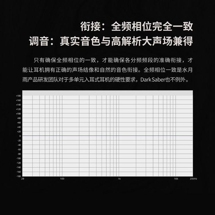 只有確保全頻相位的一致,才能確保各分頻頻段的準確銜接,才能讓耳機擁有正確的聲場結像和自然的音色銜接全頻相位一致是水月雨產品研發團隊對於多單元入耳式耳機的 硬性要求,Dark Saber也不例外。