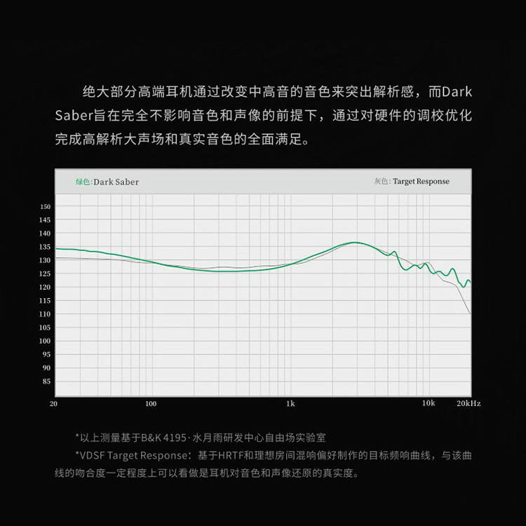 絕大部分高端耳機透過改變中高音的音色來突出解析感,而Dark Saber旨在完全不影響音色和聲像的前提下,通過對硬件的調校優化完成高分辨率大聲場和真實音色的全面滿足 。