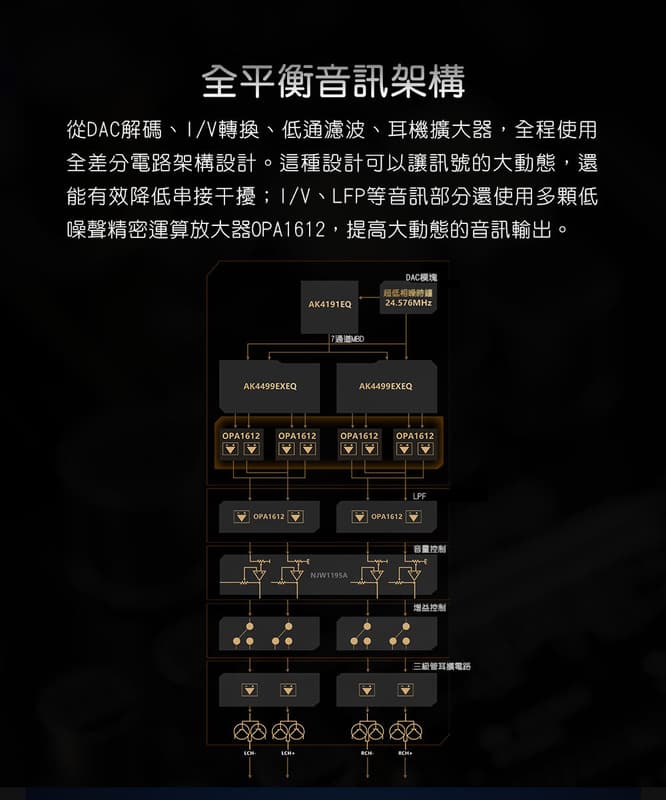 ● 全平衡電路架構 + 三顆飛秒級晶振,實現純淨寬廣音場