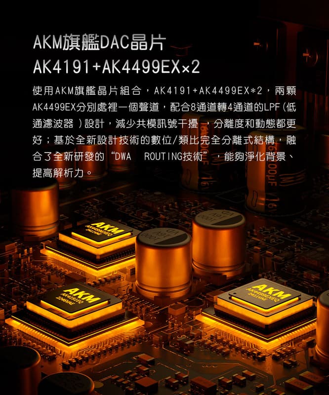 ● 採用AKM最新旗艦DAC組合AK4191 + 雙AK4499EX,打造純淨細膩的聲音解析