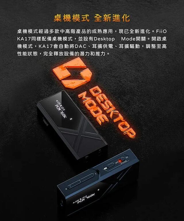 桌機模式 全新進化|配備桌機模式,並設有Desktop Mode開關。開啟桌機模式,KA17會自動將DAC、耳擴供電、耳擴驅動,調整至高性能狀態,完全釋放設備的潛力和推力。