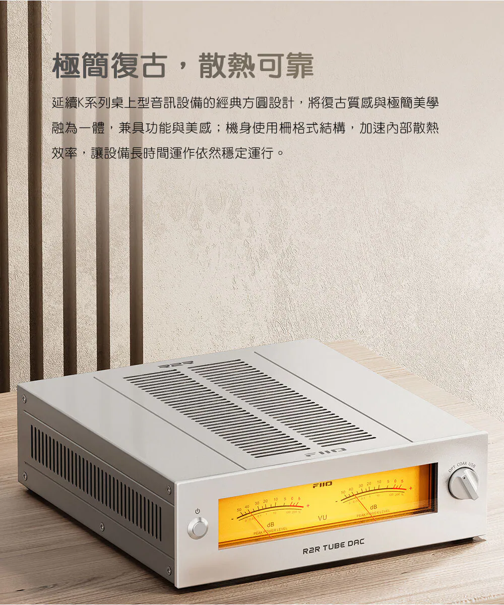 WARMER R2R 以復古暖聲為核心理念,結合 R2R 電阻陣列與真空管緩衝架構,呈現溫潤、厚實且富有情感的聲音走向。從暖色背光 VU 表的律動,到真空管所帶來的自然泛音與空氣感,讓音樂不只被聽見,更能被感受。