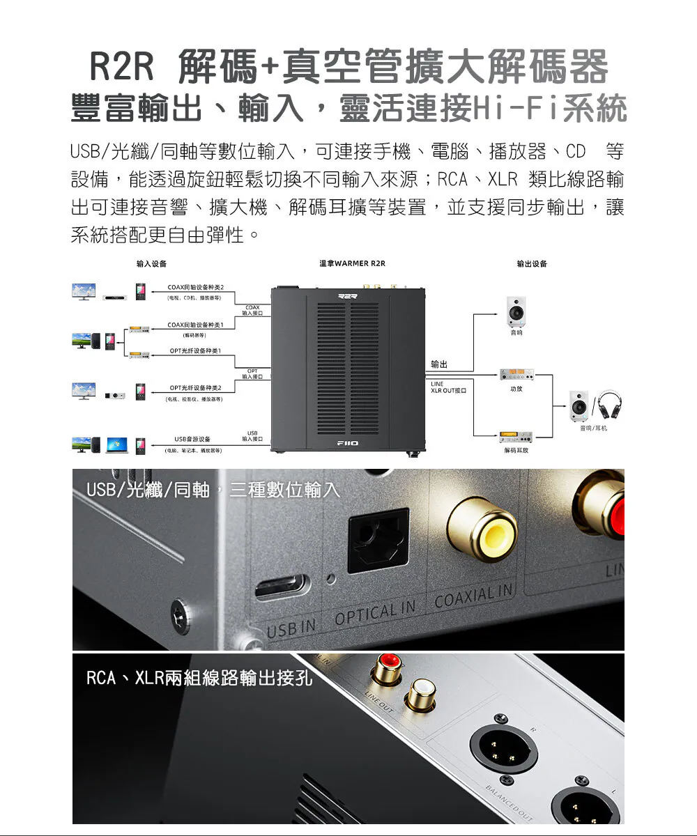 在連接性方面,支援 USB、光纖與同軸三種數位輸入,可輕鬆連接電腦、播放器、CD 等設備。類比端提供 RCA 與 XLR 雙輸出,並支援同步輸出,方便串接擴大機或主動式音響,打造完整 Hi-Fi 系統。