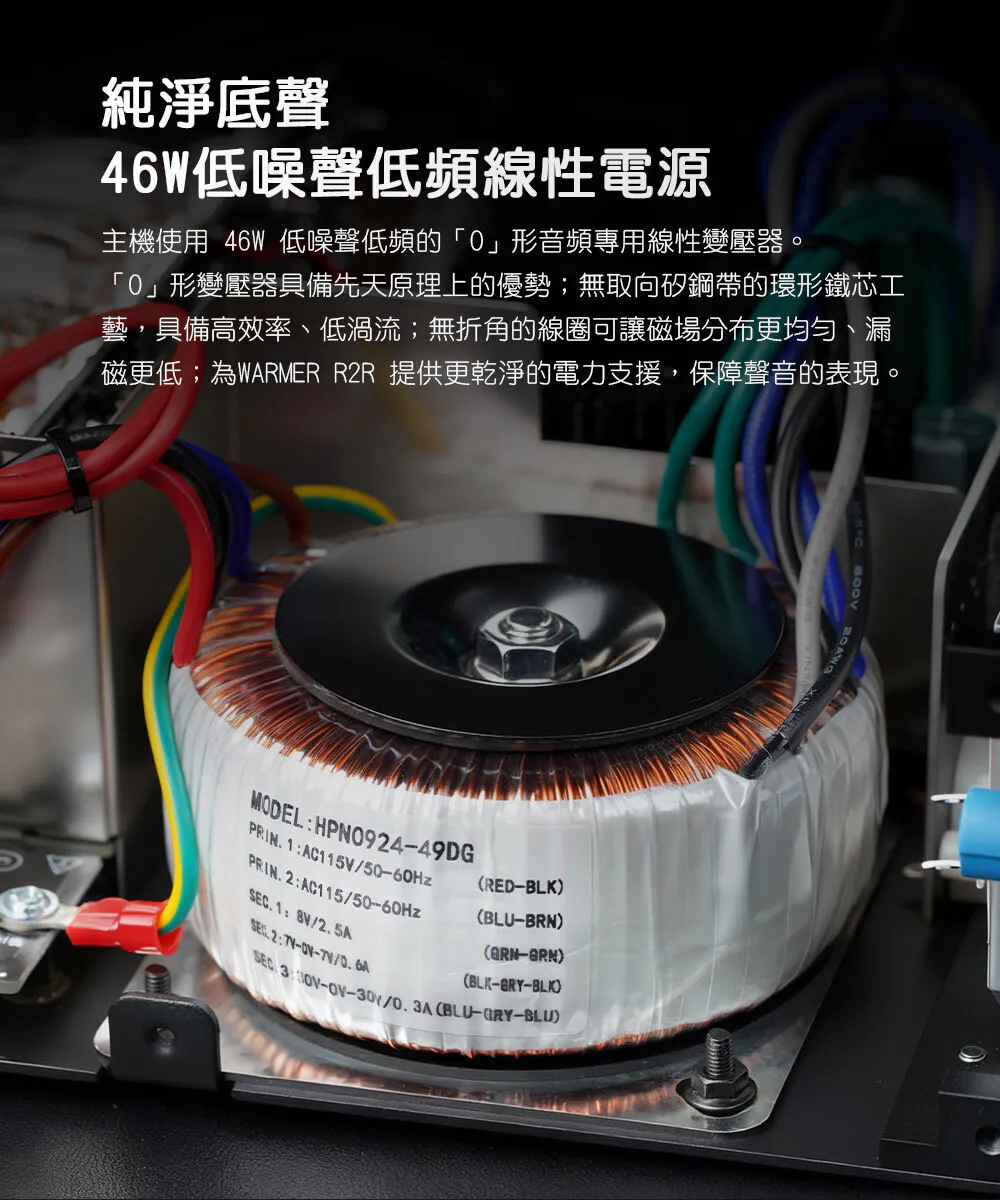 ● 46W O 型低噪音線性電源,提供乾淨穩定電力基礎