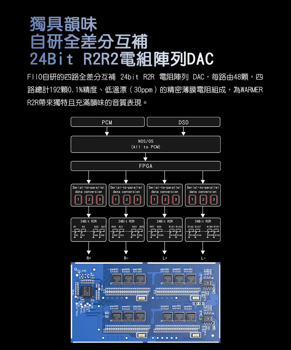 ● 自研全差分互補 24bit R2R 電阻陣列 DAC,聲底厚實有韻味