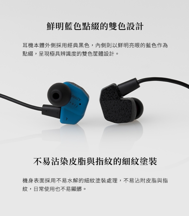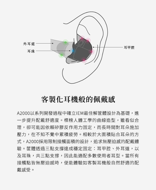 在配戴設計方面,A2000 以 IEM 人體工學結構為基礎,透過耳甲腔、外耳道與耳珠三點支撐來固定耳機,減少接觸面積並降低壓迫感。這種設計讓耳機能自然貼合耳型,即使長時間使用也能保持舒適。搭配 final 特製矽膠耳塞,可同時兼顧穩定配戴與良好的隔音效果。