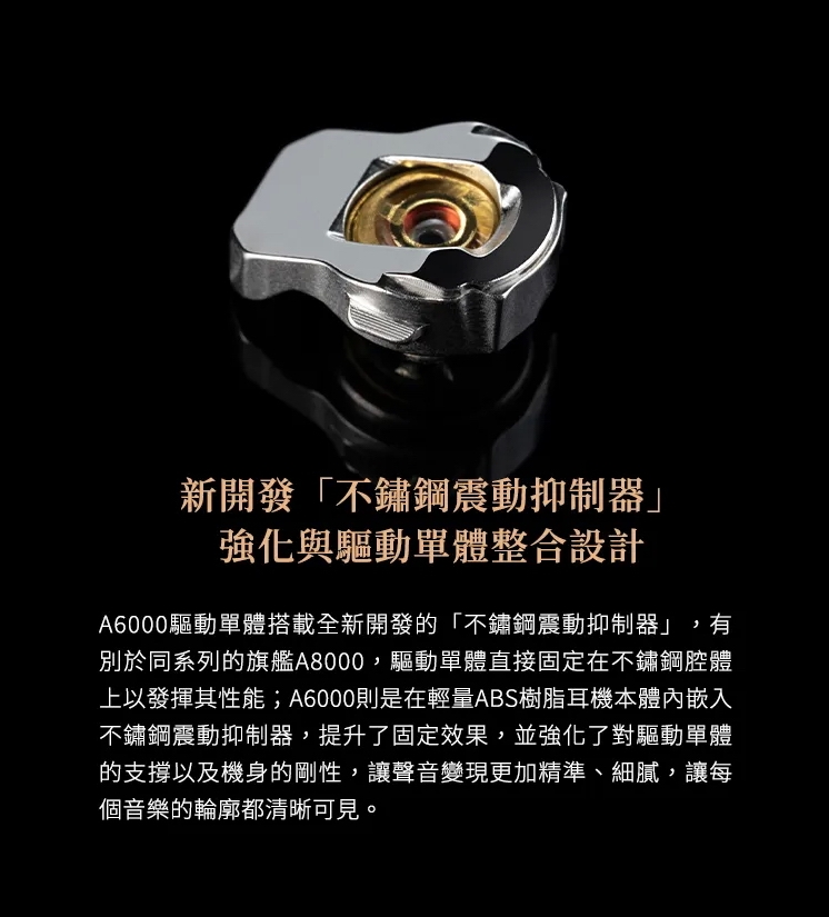 為了實現更高的穩定性和聲音還原度,品牌在外部加入CNC不鏽鋼成形的單元固定座,模仿旗艦級A8000的設計。這不僅加強了諧震的抑制性能,還使單元的發聲點更貼近出音嘴,提供更高效的傳輸性能。震膜、f-Core DU、不鏽鋼單元固定座三者的完美結合,使A6000在實現高效細節還原和精準聲音定位的同時,保留一定的潤澤感,提供優秀的聲音表現。