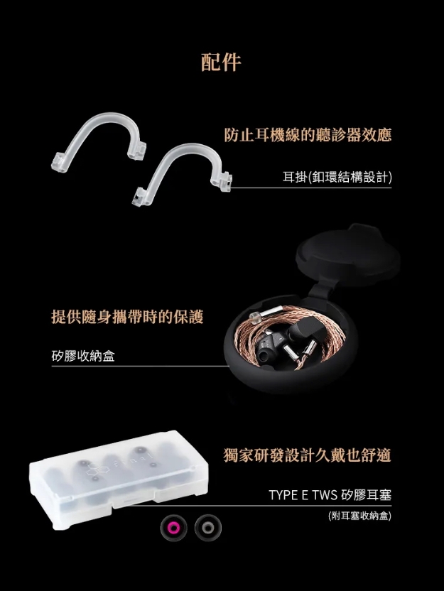 為確保使用者享受最佳音質體驗,產品配備開口較大的「TYPE E-TWS」耳塞,提供足夠的強度和柔軟舒適感,並提供SS/S/M/L/LL五種尺寸,讓使用者找到最適合的佩戴感受。配件包括防止耳機線聽診器效應的耳掛(釦環結構設計)、矽膠收納盒,以及TYPE E TWS矽膠耳塞(附耳塞收納盒)。