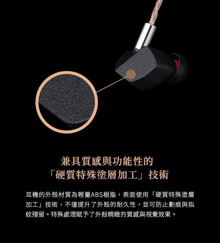 耳機外殼採用輕量ABS樹脂,表面使用「硬質特殊塗層加工」技術,提升耐久性,防止劃痕和指紋殘留,賦予精緻的質感和視覺效果。A6000採用2PIN接頭和單晶銅OCC升級線材,柔軟易佩戴,具有優異的導電性,實現溫暖而高解析度的音質,突出音樂細節,讓每個音符更加清晰動聽。