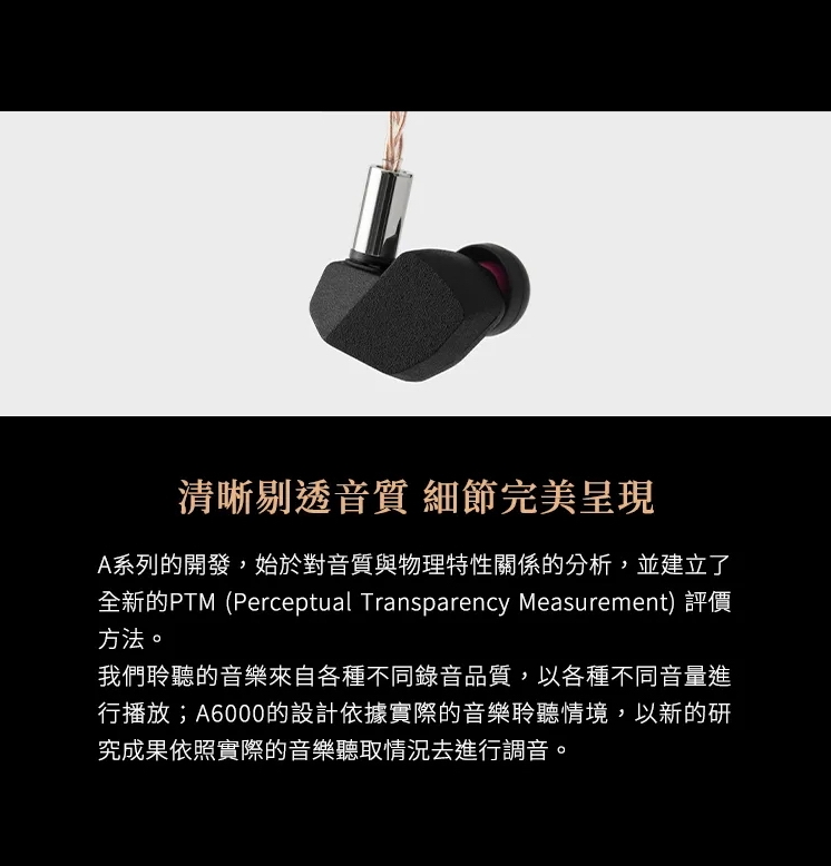 品牌還開發了「PTM」(感知透明度測量)評測方法,通過分析不同人對聲音的敏感度,結合單元設計和線材等客觀因素,打造最具「透明感」的音色。A6000在調音時應用了此方法,因此在空間感和細節定位上有優秀的表現。