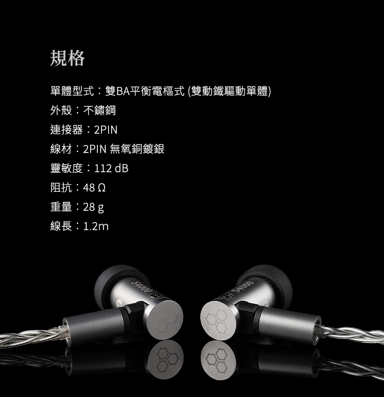 - **單體型式**:雙BA平衡電樞式(雙動鐵驅動單體)