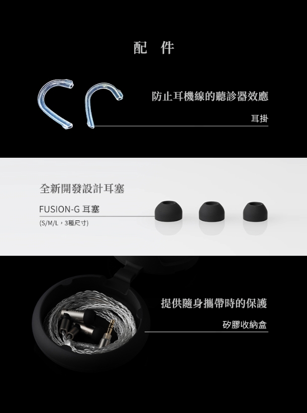 ● 新開發「FUSION-G」耳塞,三種材質結合,佩戴舒適又具優異隔音