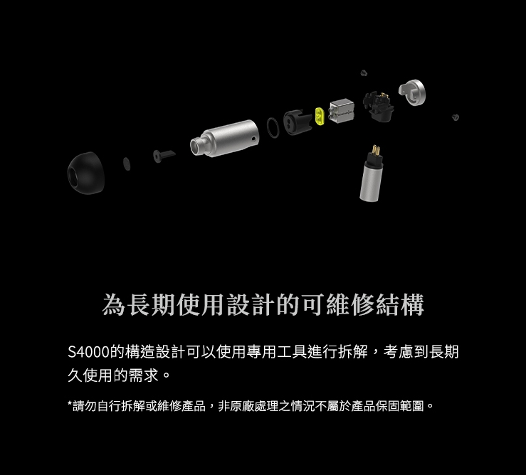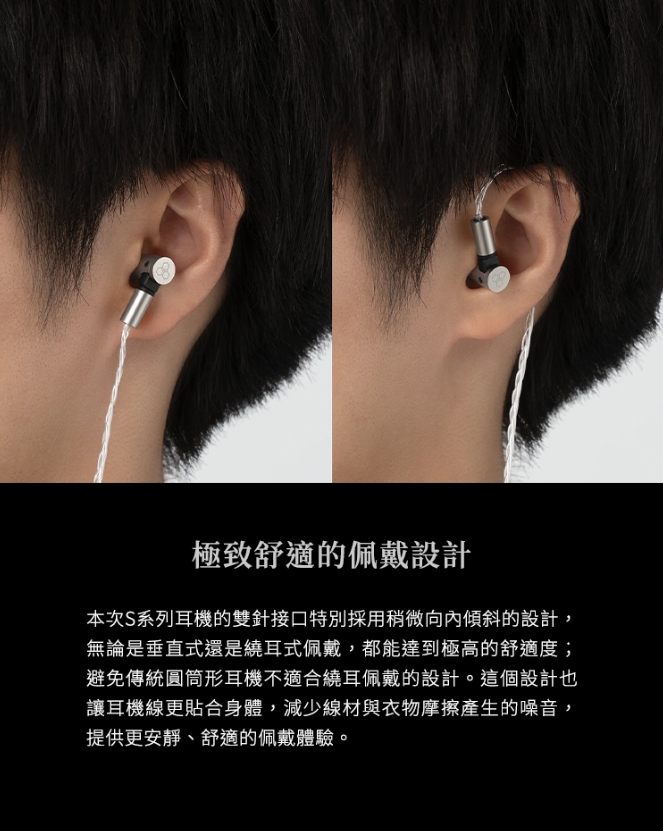 S4000 針對佩戴習慣加以改良,2PIN 接口稍微向內傾斜,方便垂直或繞耳式配戴,減少線材摩擦而產生的噪音。可維修結構則能延長產品使用壽命,讓每一位使用者都能輕鬆保養並長期使用。