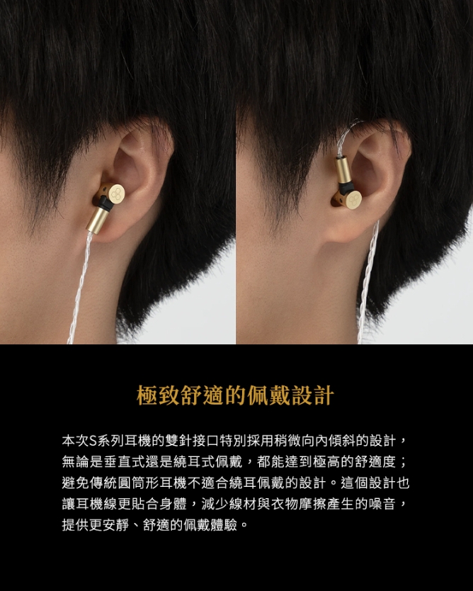 耳機配備了稍微向內傾斜的 2PIN 接口,可自由選擇垂直或繞耳方式,不僅能減少線材與衣物之間的摩擦聲,長時間配戴更輕鬆無負擔。