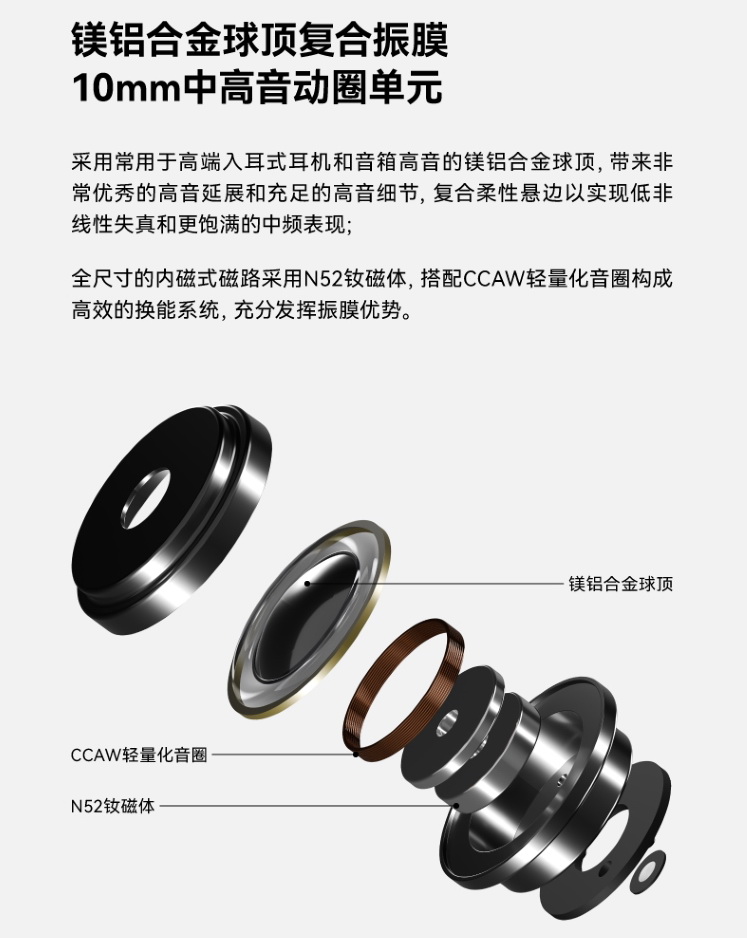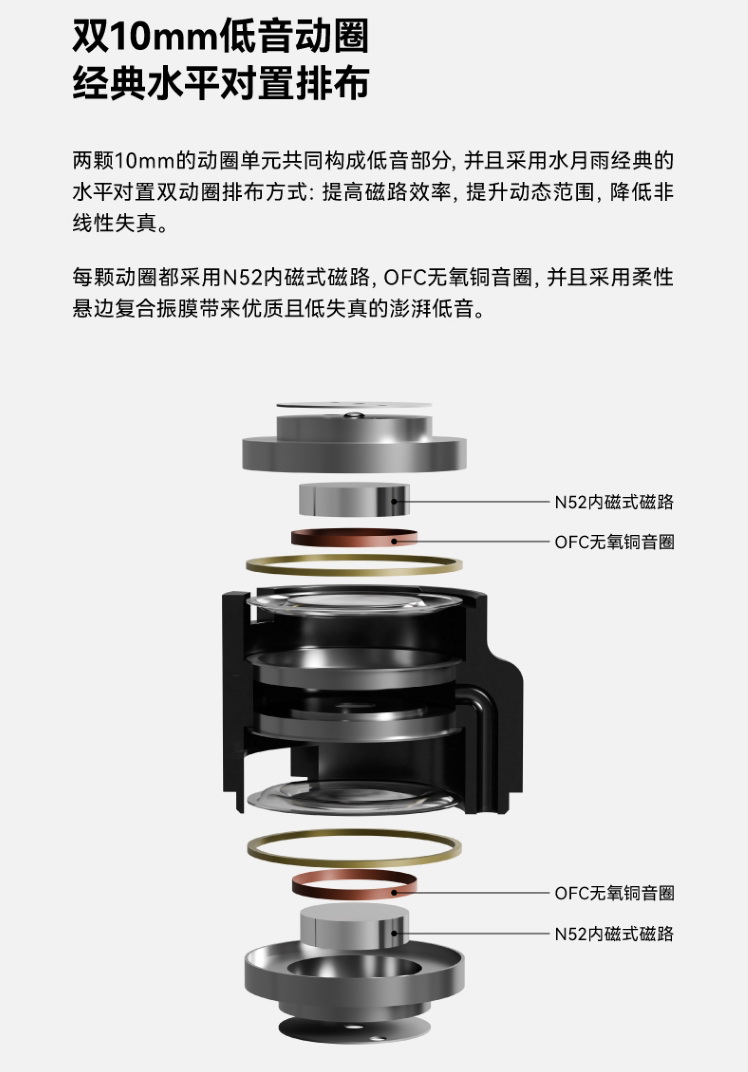 搭載 10mm 鎂鋁合金球頂複合振膜動圈單元,帶來延伸清晰的高頻與充滿細節的中頻表現;雙 10mm 動圈低音模組採用水平對置設計,結合 N52 磁體與 OFC 音圈,展現深沉有力且低失真的低頻。