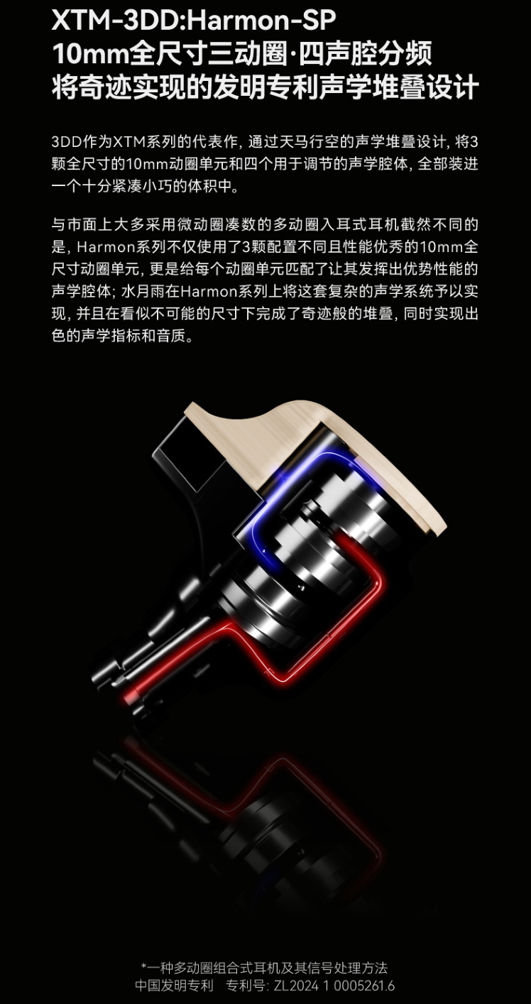 耳機內部搭載三顆全尺寸 10mm 動圈單元,並透過四腔體聲學堆疊結構進行分頻處理,將低頻、中頻與高頻完美銜接,實現既震撼又細緻的聲音表現。相較於傳統微型多單元,Harmon-SP 在有限體積中完成更高階的聲學堆疊。