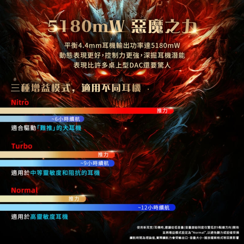 還在為耗電的耳機而煩惱嗎?按下 NOS 按鈕,我們的Diablo 2就會進入野獸模式。Diablo 2提供三種輸出模式:Normal(適用於入耳式耳機)、Turbo(適用於中靈敏度耳機)以及 Nitro(適用於要求較高的耳機),最大輸出為 19.2V。