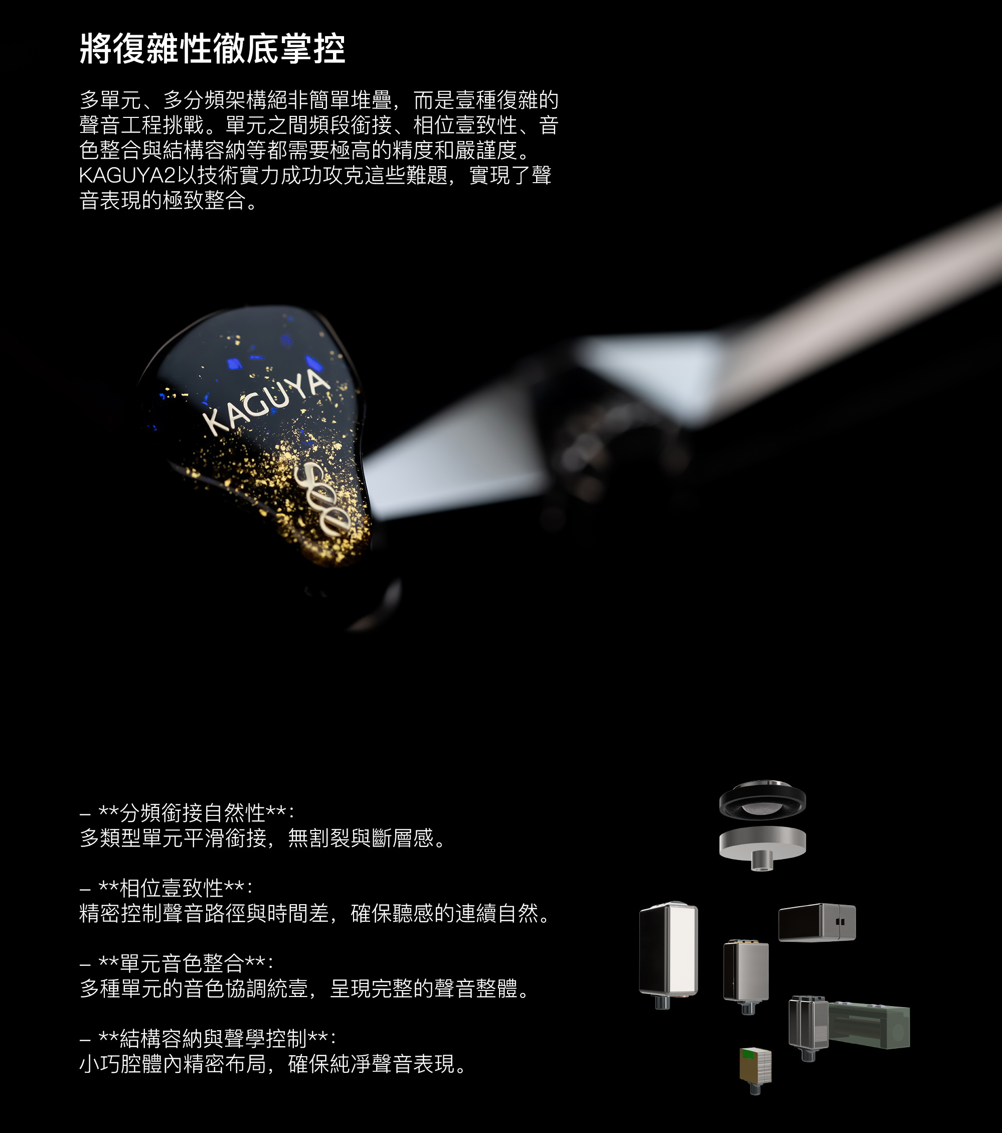 多單元協作並非簡單堆疊,KAGUYA II 的五路導音系統+三重衰減通道確保頻率能量在時間軸與相位上的高度協調,避免交叉頻點能量堆疊或失真,實現音色一致性與聲場的純淨流暢。
