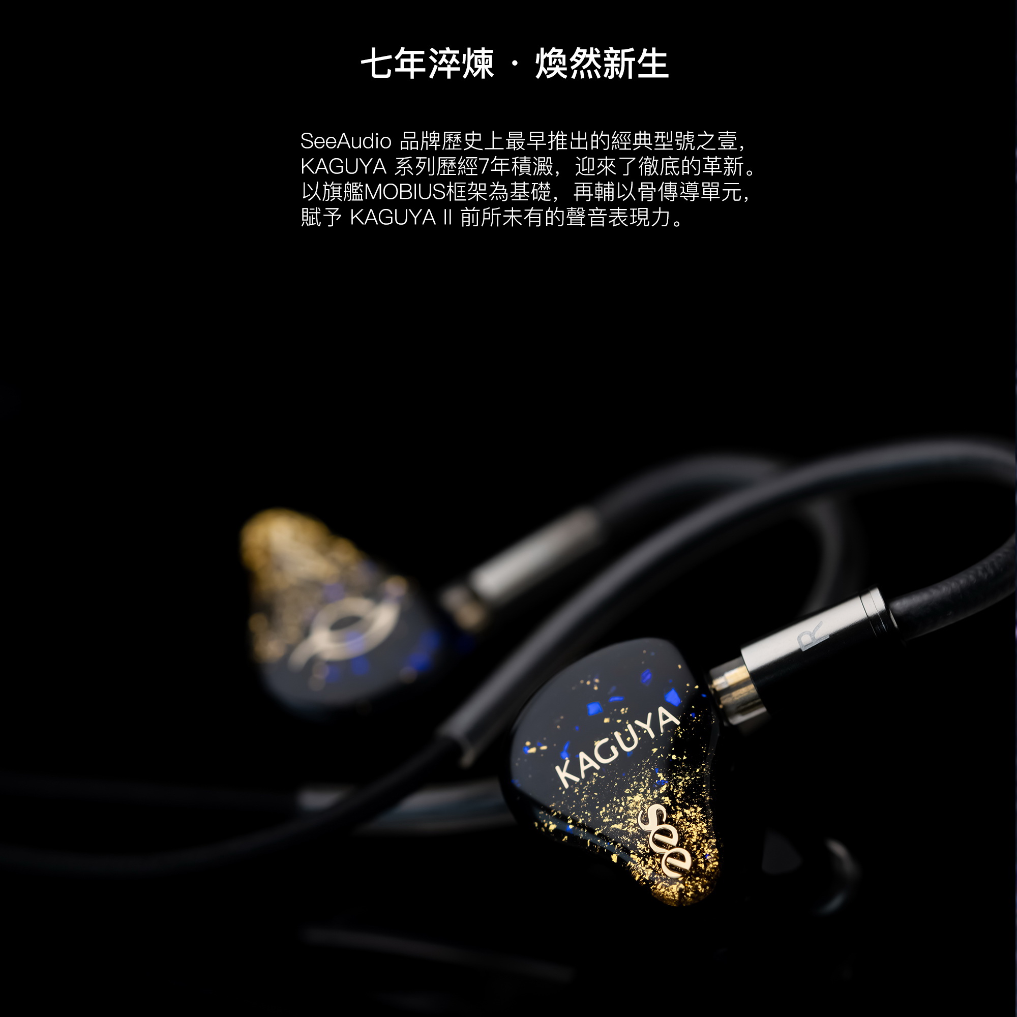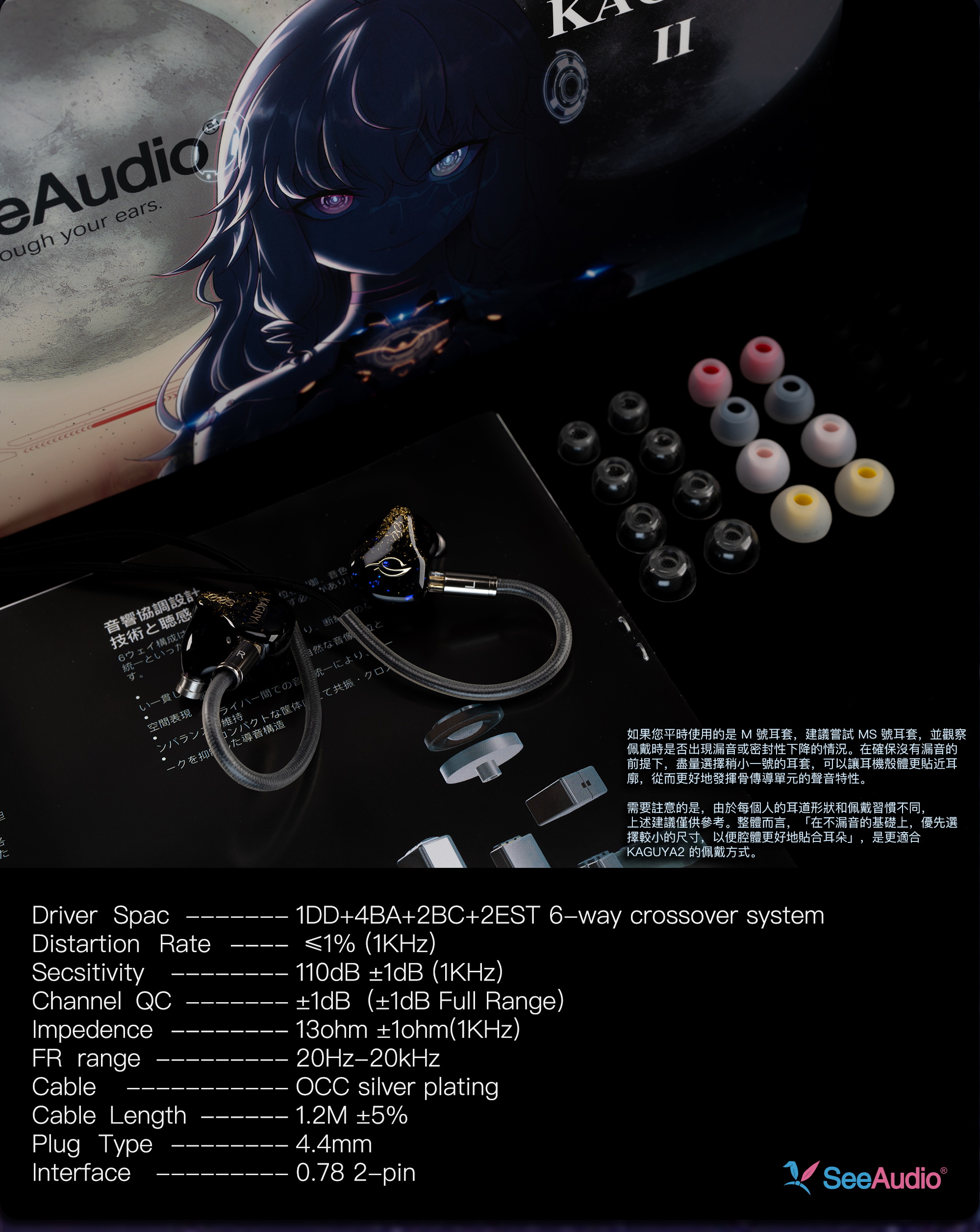 KAGUYA II 作為 SeeAudio 旗下經典系列的革新版,採用全新 MOBIUS 六分頻調音系統,搭載1動圈、4動鐵、2靜電及2骨傳導單元,透過嚴謹的分頻技術讓每顆單元都在系統內發揮最大價值。動圈負責紮實低頻與空氣感,動鐵呈現中高頻細節與定位,靜電單元延展至40kHz,骨傳導則打破頭部陰影效應,帶來獨特的內部共鳴與立體聽感。