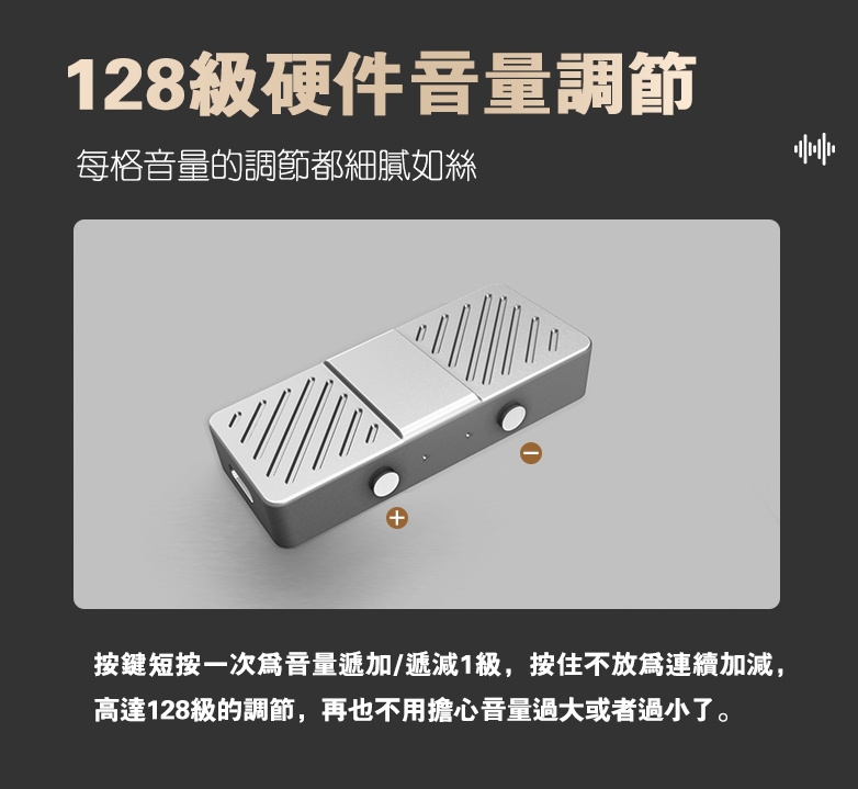 ● 128級硬體音量控制+兩檔增益模式,調整更細膩