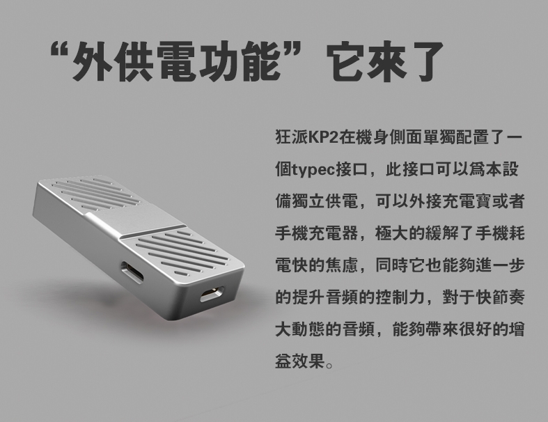 KP2機身側面另設一個Type-C接口,可接充電寶或手機充電器獨立供電。除了能延長手機的續航使用時間,也進一步提升了音頻控制力,面對快節奏、大動態的音樂更加游刃有餘。