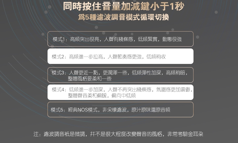 ● 多種濾波調音模式,享受多元風格的聆聽體驗