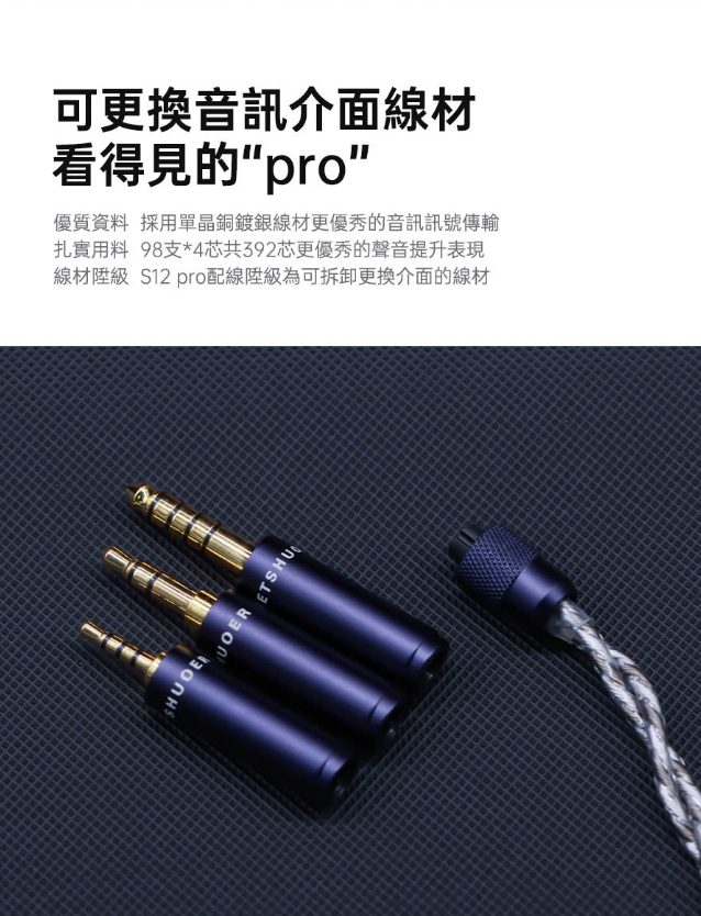 原始S12是不可換3.5/4.4插頭,S12 PRO版本升級為三合一可換式3.5/2.5/4.4插頭。