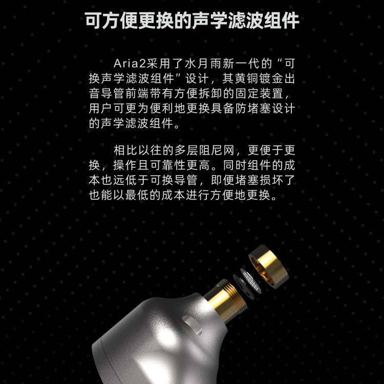 Aria2採用了水月雨新 一代的「可換聲學濾波組件」設計, 其黃銅鍍金出音導管前端帶有方便拆卸的固定裝置,用戶可更為便利地更換具備防堵塞設計的聲學濾波組件。