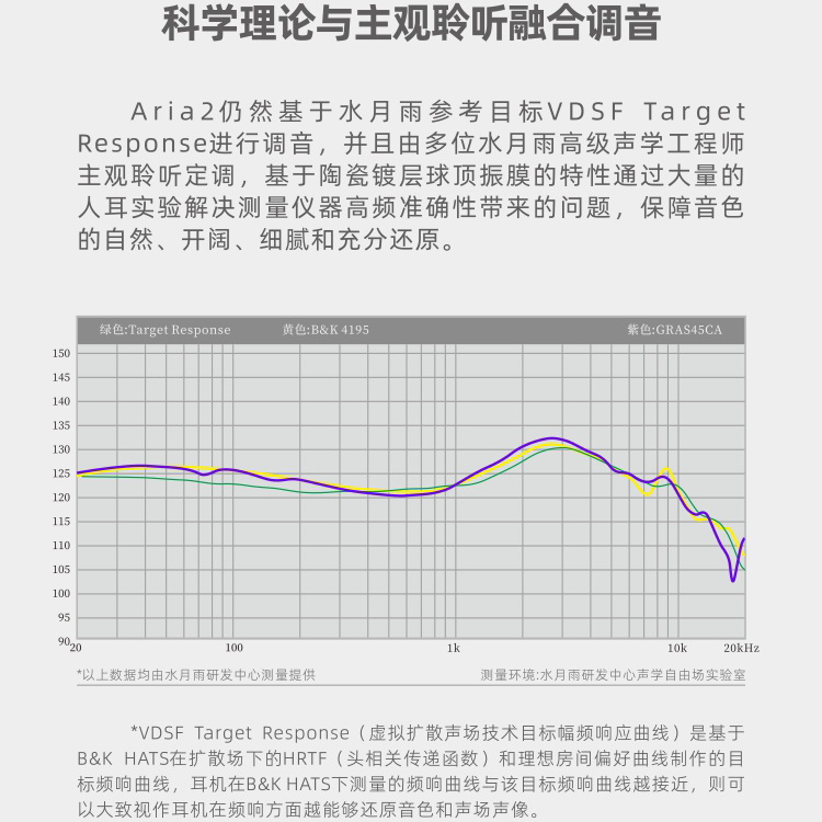 Aria2仍然基於水月雨參考目標VDSF Target Response進行調音,並且由多位水月雨高級聲學工程師主觀聆聽定調,基於陶瓷鍍層球頂振膜的特性通過大量的人耳實驗解決測量儀器高頻 準確性帶來的問題,保障音色的自然、開闊、細膩和充分還原。