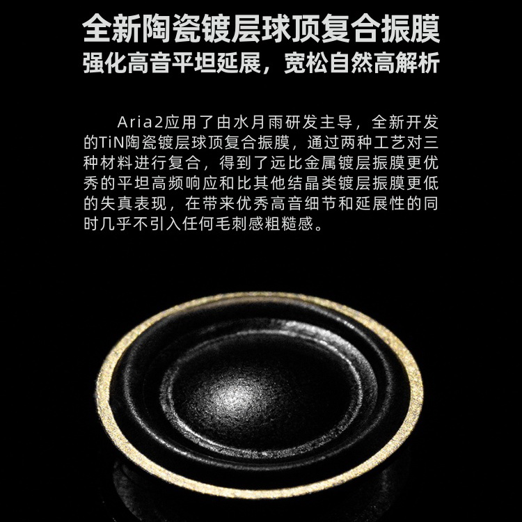 Aria2應用了由水月雨研發主導,全新開發的TiN陶瓷鍍層球頂複合振膜,透過兩種製程對三種材料進行複合,得到了遠比金屬鍍層振膜更優