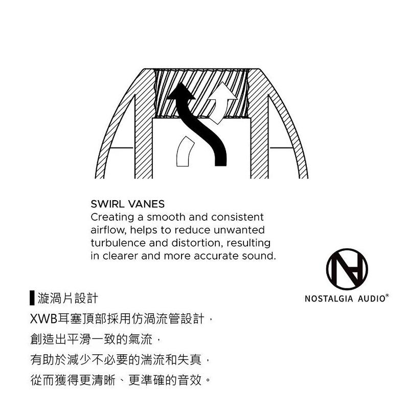 XWB耳塞頂部採用仿渦流管設計, 創造出平滑一致的氣流, 有助於減少不必要的湍流和失真, 從而獲得更清晰、更準確的音效。